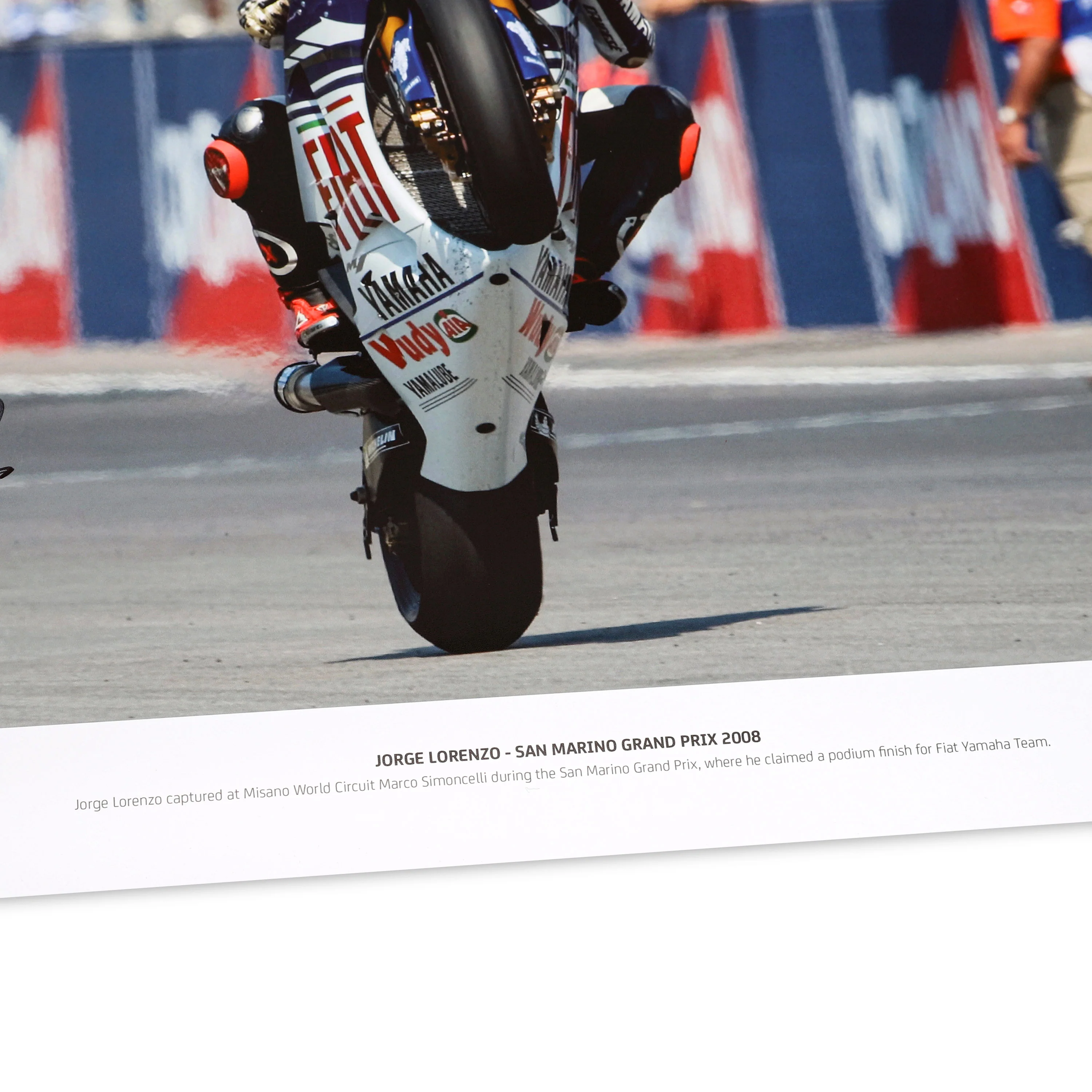 Own this piece of MotoGP™ memorabilia; this photograph captures Jorge Lorenzo riding at the San Marino Grand Prix during the 2008 season for the Fiat Yamaha Team. It has since been signed by the man himself, perfect to celebrate his impressive second place finish.